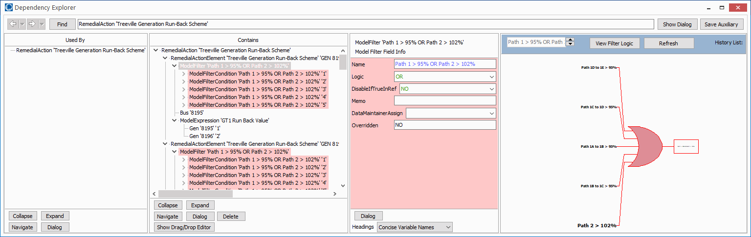 The intent of the dependency explorer is to enhance the understanding of remedial actions used with contingency analysis. It allows for the viewing and modification of objects that are used in the definition of remedial actions, as well as any conditional contingency actions. Dependencies are objects that are necessary to completely define another object. Some examples of dependencies include: