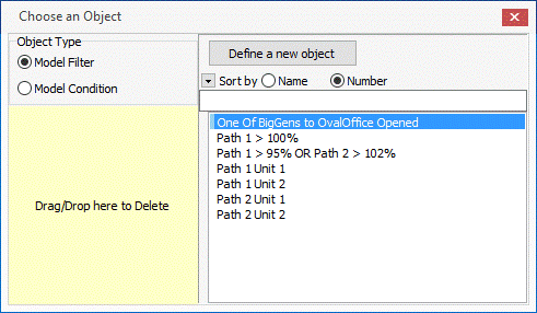 To add a Model Filter or Model Condition to another Model Filter, select the Model Filter or Model Condition in the object selector by left-clicking on it and then drag and drop it on the appropriate Model Filter in the Contains pane.