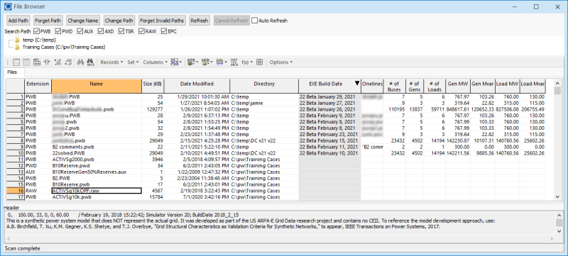 For PWB, EPC, and RAW files, while searching PowerWorld peeks inside the files to collect summary information about each file. The File Browser can then provide special summary information which can then be searched, sorted, and filtered to help you find files of interest to you. A descriptions of each file type any special features for that file type is described in the next table.