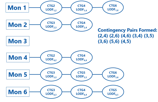 The following example shows how contingency pairs are formed. LODFs are calculated for each of the monitored lines for each of the outages. The monitored lines are indicated by the rectangles on the left. The LODFs are used to calculate the flow on the monitored line during the outage. A significant outage is one in which the loading on the monitored line is within the specified percent loading range. Each of the CTG bubbles next to a monitored line indicates a significant outage. New contingency pairs are formed by combining pairs of significant outages for any monitored line and all other outages being studied. In this example CTG 1 through 6 are studied outages and are combined with each of the significant outages that cause loadings on the monitored lines.