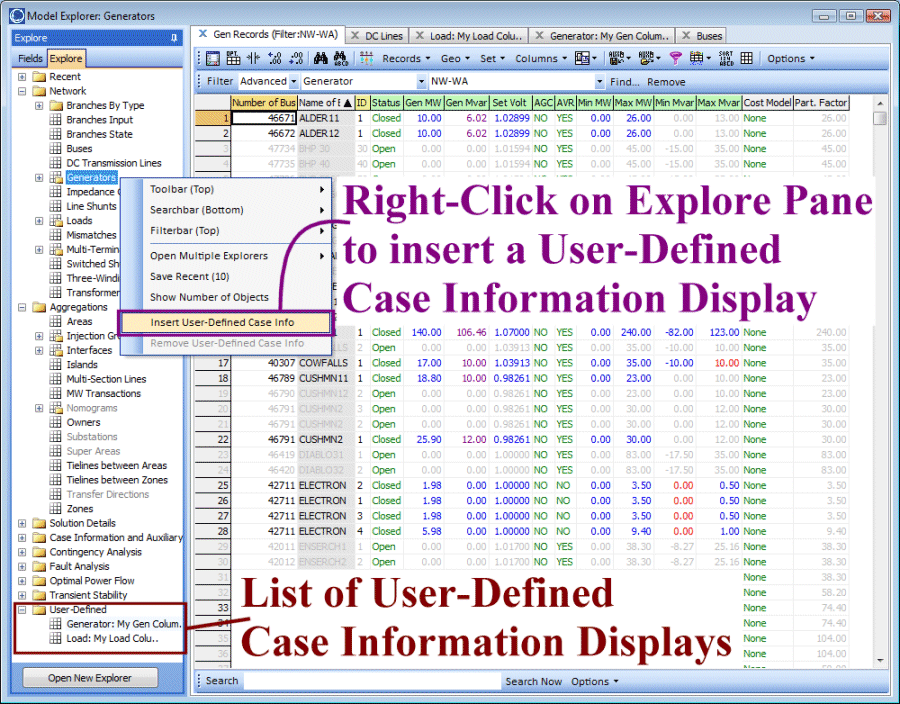 While it is normally sufficient to customize the case information displays that come with the program, it is sometimes convenient to create different sets of columns, filtering, sorting, etc... for the same object type. One set of generator fields may be convenient for studying voltage regulation problems, while another set of generator fields may be convenient for looking at MW-related information. This ability is provided using the User-Defined Case Information Displays. This provides the ability to switch between different sets of columns, filters, sorting etc... without requiring repeated customizations.