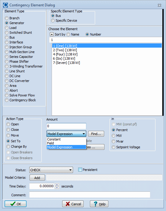 Added in Version 19, build on December 18, 2015. The check box Evaluate Field in Contingency Reference State will impact how the Model Expression behaves when evaluated during the contingency analysis solution. This can impact the behavior when the model expression is used as part of a Contingency Element, a ModelConditionCondition, an advanced filter, Custom Monitor, or as part of a Injection Group participation point calculation when evaluated for use during contingency analysis.