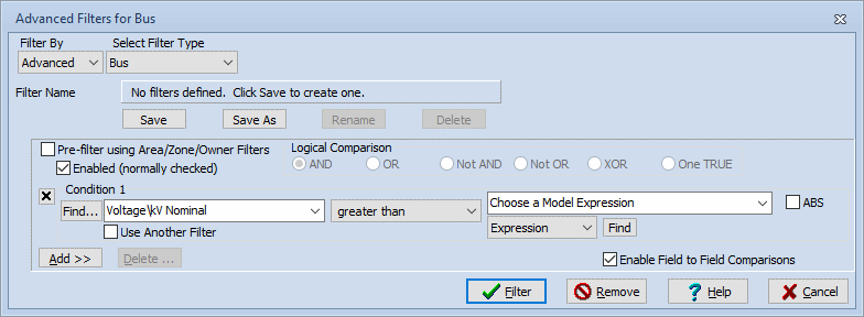 After model expressions have been defined, new options will appear on the Contingency Element Dialog and on the Advanced Filter Dialog.
