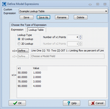 The Save, Save As, Rename, and Delete buttons and the drop-down list of expressions at the top of the dialog allow for the additional of new expressions, modification of existing expressions, and removal of existing expressions. There are two types of Model Expressions: an expression and a lookup table.