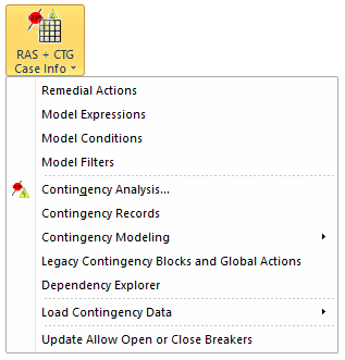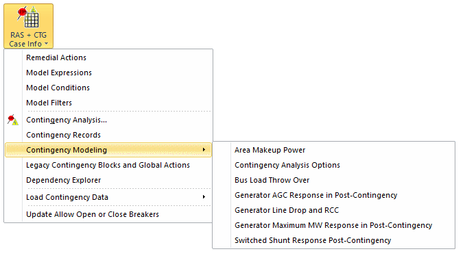 This menu contains options that are relevant for defining contingencies and remedial actions and running contingency analysis.