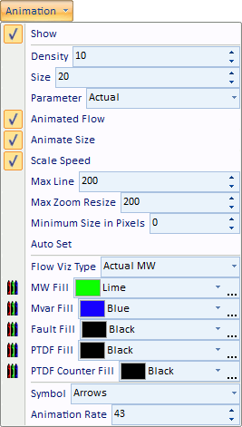 Allows you to choose whether or not to display animated flows individually on Branch, Load, Generator and Shunt objects. Uncheck the box(es) for the objects that you do not wish to display animated flows.
