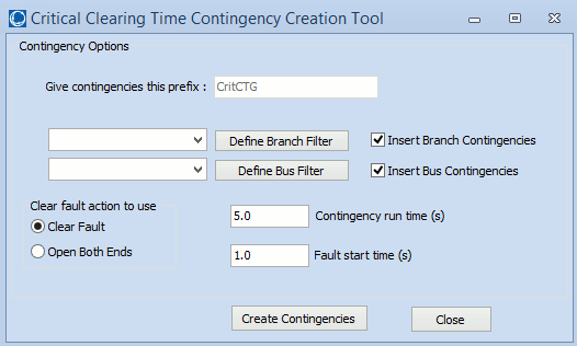 Note: These fields are available for any contingency element, so it is not necessary to use the critical clearing time dialog to create critical clearing time contingencies. You can set the flag on the fault clearing action to convert a standard contingency to a critical clearing time calculation.