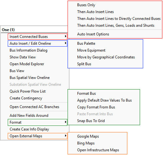 Right-clicking on the bus will display its local menu. The local menu offers you the chance to view the corresponding Bus Dialog, the Quick Power Flow List, and the Bus View Display. When the application is in Edit Mode, the local menu will also allow you to add bus fields to the bus and to insert any undrawn buses connected to the selected bus. Bus Fields are often placed close to the bus to indicate its voltage magnitude, voltage angle, and other relevant information. A more complete description of
