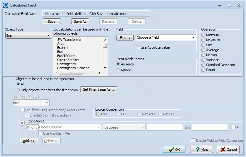Keep in mind that objects included in the calculation will first be determined by the object type. If for example branch is selected, then all branches will be considered. Setting a filter will limit the branches to only those branches that meet the filter. If the calculated field is used with buses, then the branches considered for a given bus will be only those branches that have a terminal bus the same as the given bus. If the calculated field is used with generators, then the branches considered for a given generator will be only those branches that have a terminal bus the same as the terminal bus of the given generator.