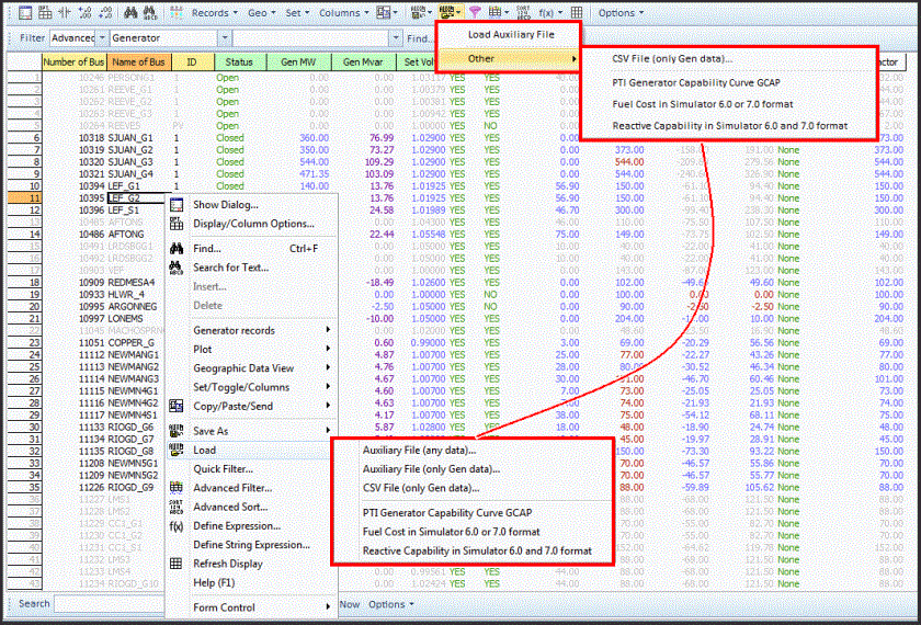 The Case Information Toolbar Load Auxiliary Menu displays the identical options as shown in the Load menu of the case information display local menu. This is depicted in the figure below. The options are described below the figure.