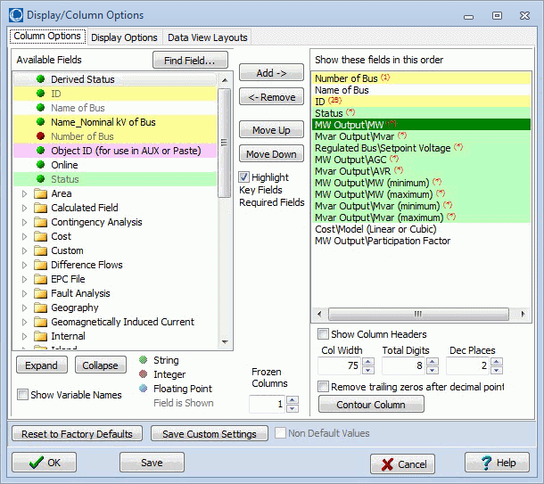 Checking this option will highlight the key fields for the type of object displayed in the case information display presently being modified. The fields highlighted in Yellow in the two lists are either the Primary key fields (numbered) or the Secondary key fields (lettered). Note that some key fields, usually the Circuit ID, are both numbered and lettered, meaning they are used as both Primary or Secondary key fields. Either ALL numbered key fields OR all lettered key fields must be included in the list of shown columns if you intend to export the data to either Excel or a text file, modify it, and paste it back into Simulator.