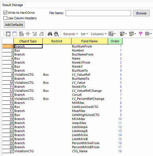 Click this button to create default Result Storage objects. The default objects will define saving of violation results and fields for the ViolationCTG object. This includes the basic information that is stored for a violation including the contingency, violated element identification, violation value, and violation limit.