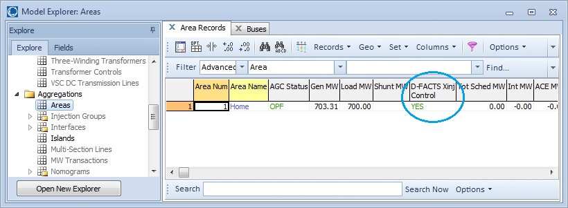 D-FACTS are also enabled on a per-area basis and a per-line basis. On the Areas tab of the Model Explorer, the DFACTS Xinj Control field should be set to YES.