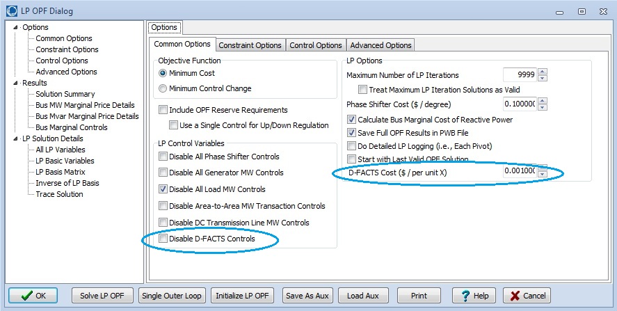 As with all controls in PowerWorld Simulator, there are three places D-FACTS OPF response has to be enabled in order to use D-FACTS as an OPF control. First, D-FACTS control should be enabled at the case level from the Common Options tab of the LP OPF Dialog by unchecking “Disable D-FACTS Controls.” “D-FACTS Cost” specifies the cost of D-FACTS operation, which is assumed to be very low or negligible.