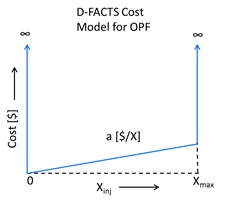 The cost is zero for D-FACTS to be off, with a slight positive cost as D-FACTS turn on. Outside of the limits, the cost is infinite. This is the out-of-limits D-FACTS cost which is $2,000,000 per unit X.