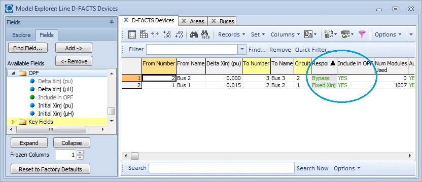 D-FACTS devices have a group of OPF-related fields. These fields are within the "OPF" folder and can be seen using the "Fields" view in the Model Explorer or from "Display/Column Options." Within this folder is the Include in OPF field.