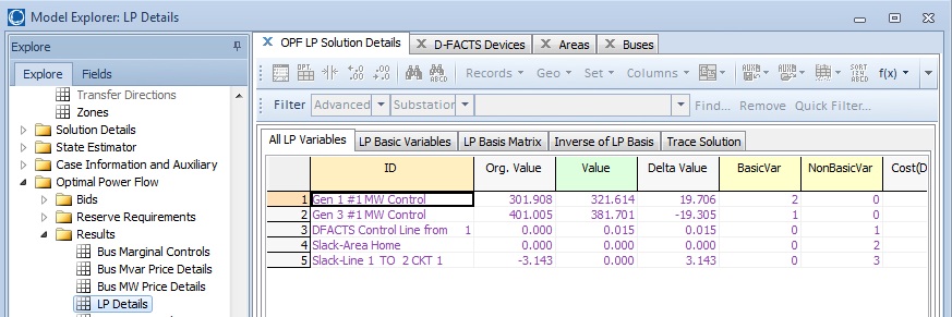 Results can be viewed under “OPF LP Solution Details.” The display shows the amount of change that occurred in the OPF for each D-FACTS device that responded.