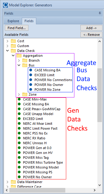 Each Data Check has a field ObjectType which indicates the type of object to which the data check applies. After creating a Data Check, fields will become available to objects of that type. These fields will be in the folder "Data Check" and will show the name of the Data Check. Also after creating a Data Check, there will be fields made available to object types which can utilize Calculated Fields of the Data Check's ObjectType. These fields will be made available under Data Check\Aggregations. See the Calculated Fields help for more information on object type relationships, The easy examples are aggregations such as an Area, Zone, Owner, or Data Maintainer which can do calculations across all the generators or buses that they contain.