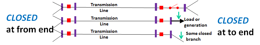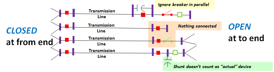 - Search starting at the device terminals traverse branches with Status = Closed looking for closed breakers, generation, or load (switched shunts are excluded here)