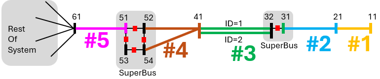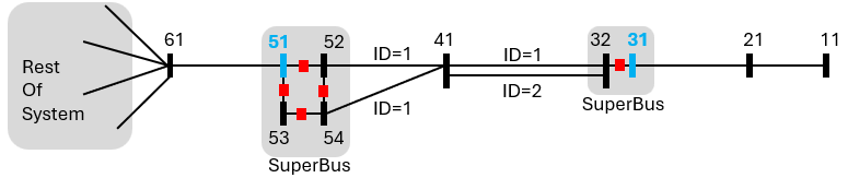 Consider the example below. Bus 51 and 31 are the primary bus inside their respective SuperBus groupings.