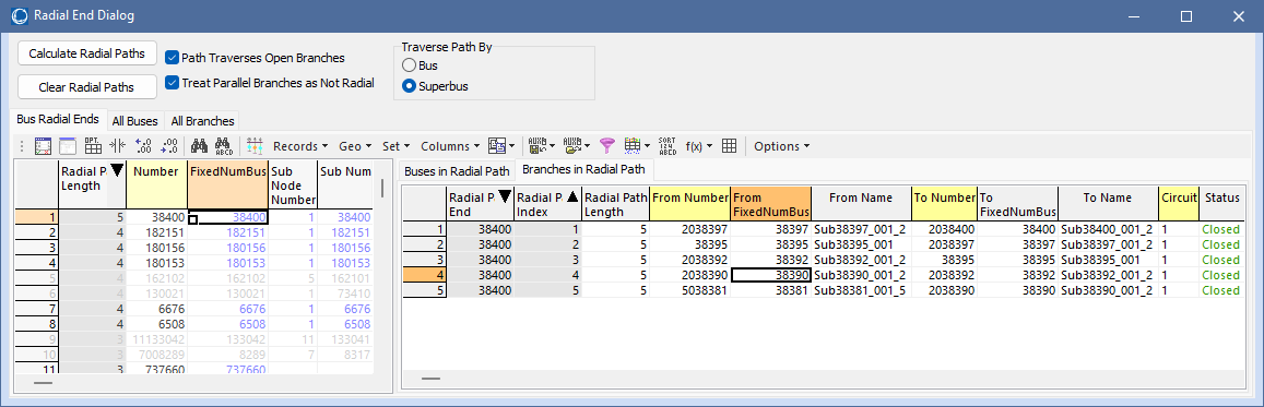 The tables below however show what the RadialEndBusNum, RadialEndIndex, and RadialEndLength fields will show for the Bus objects in the first table, and the Branch objects in the second table. The columns show what these will under different options for the Traverse by Bus or SuperBus and how handle parallel branches.