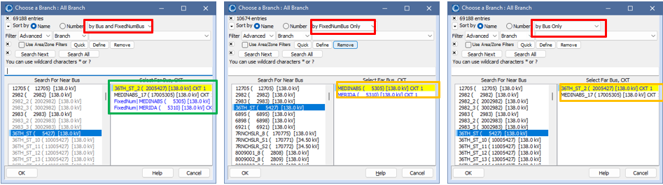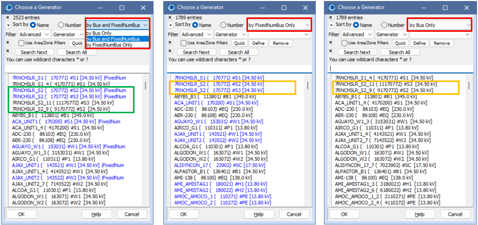 For example on the Gen, Load and Shunt Find Dialogs there will be a drop-down that has 3 choices to choose (1) By Bus Only, (2) by Bus and FixedNumBus, or (3) by FixedNumBus Only. An example image is the next image. The entries in the find dialog in Blue represent identifiers using the FixedNumBus while the entries in black are using the bus number. Note that when choosing to show by Bus and FixedNumBus that the same object may appear twice in the list as it can be identified in 2 different ways.