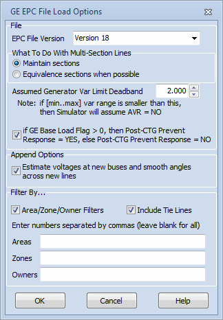 If desired, only data in with specific areas, zones or owners can be loaded from the EPC file by using this option. Checking the Area/Zone/Owner Filters box will display the edit boxes for entering the Area, Zone, and Owner numbers. You can also check the Include Tie Lines box to read in branches for which only one of the two terminal buses is designated with the specified area, zone or owner. Leaving this box unchecked will force the requirement that BOTH branch terminal buses meet the specified areas, zones or owners for it to be read from the EPC file.