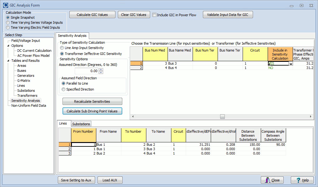 Transformer Ieffective GIC Sensitivity can identify transmission lines with greatest effect on transformer GIC current. Click Recalculate Sensitivities to compute this type of calculation.