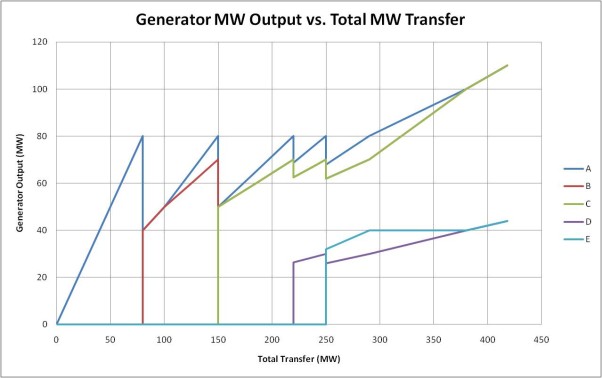 An example of a injection group with 5 generators is shown below along with the dispatch at various transfer levels: