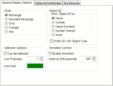 Each geographic data view display object can be identified by name, number, or a combination of the two. When a choice other than None is selected, the appropriate identification for that object will be displayed. When Prefix ID with Object Type is selected, the object type will be prefixed along with the main identifier. This option is useful when trying to distinguish between the different types of objects shown on a given display.
