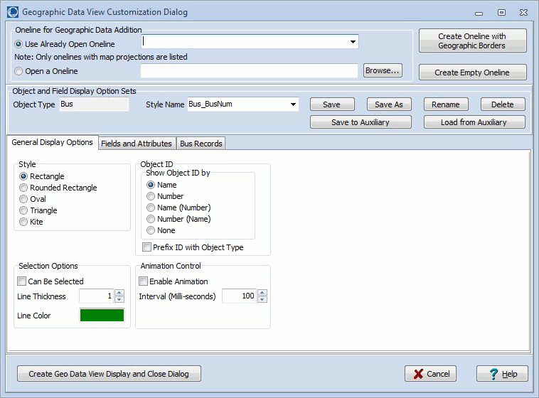 Because geographic data views are dependent on having geographic latitude and longitude information available, the oneline that is selected must have a valid map projection in use. Only those open onelines that currently have a map projection in use will be listed in the dropdown box and any oneline opened from a file will be checked for a valid map projection. If a valid map projection does not exist, new geographic data view objects will not be added to the oneline.