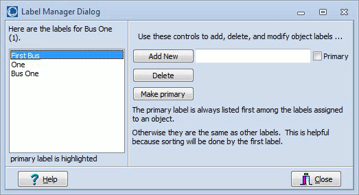 Click this button to add a new label after entering the new label in the box to the right of the button. If this new label should be the primary label, check the Primary box. Labels must be unique for each type of object. That means that there cannot be two buses labeled One. However, there could be objects of different types with the same label. There could be a bus and a generator both labeled One. If attempting to label an object with a label that has already been used by the same object type, the label will be assigned to the current object and removed from the object to which it was previously assigned.