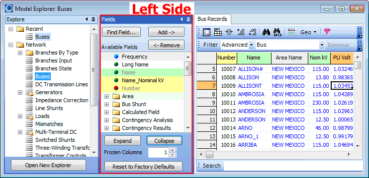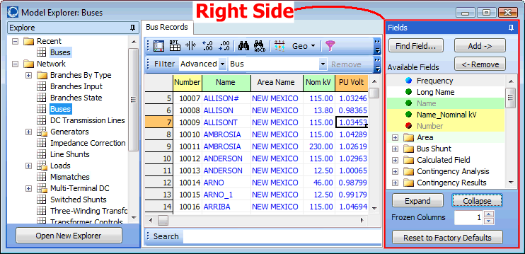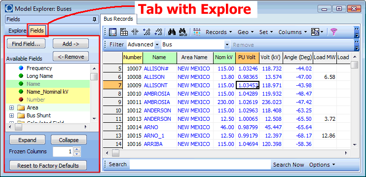 The Fields Pane on the Model Explorer provides direct access to all the fields available for the case information display shown. The same features can also be accessed by choosing Display/Column Options on the case information toolbar to open the dialog for Configuring the Case Information Displays. A picture of the Fields Pane is shown at the bottom of this topic.
