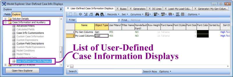 While it is normally sufficient to customize the case information displays that come with the program, it is sometimes convenient to create different sets of columns, filtering, sorting, etc... for the same object type. One set of generator fields may be convenient for studying voltage regulation problems, while another set of generator fields may be convenient for looking at MW-related information. This ability is provided using the User-Defined Case Information Displays. This provides the ability to switch between different sets of columns, filters, sorting etc... without requiring repeated customizations.
