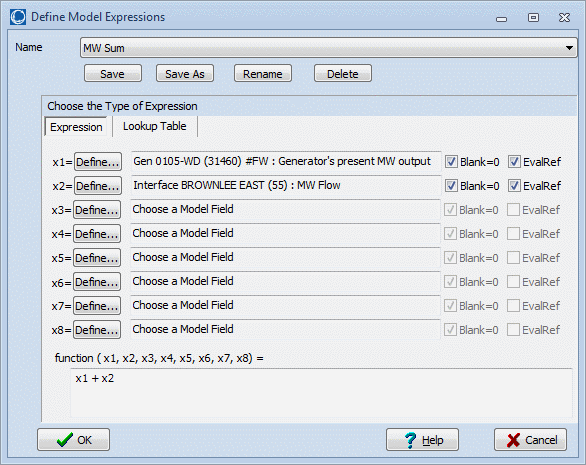 The Save, Save As, Rename, and Delete buttons and the drop-down list of expressions at the top of the dialog allow for the additional of new expressions, modification of existing expressions, and removal of existing expressions. There are two types of Model Expressions: an expression and a lookup table.