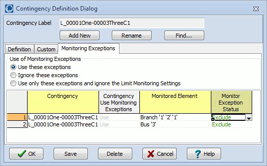 Use only these exceptions and ignore the Limit Monitoring Settings - Select this option to completely ignore the monitoring defined with the case Limit Monitoring Settings. Only those exceptions with a Monitor Exception Status of Include will be monitored for this contingency. If the monitoring exceptions list is empty, nothing will be monitored for this contingency.