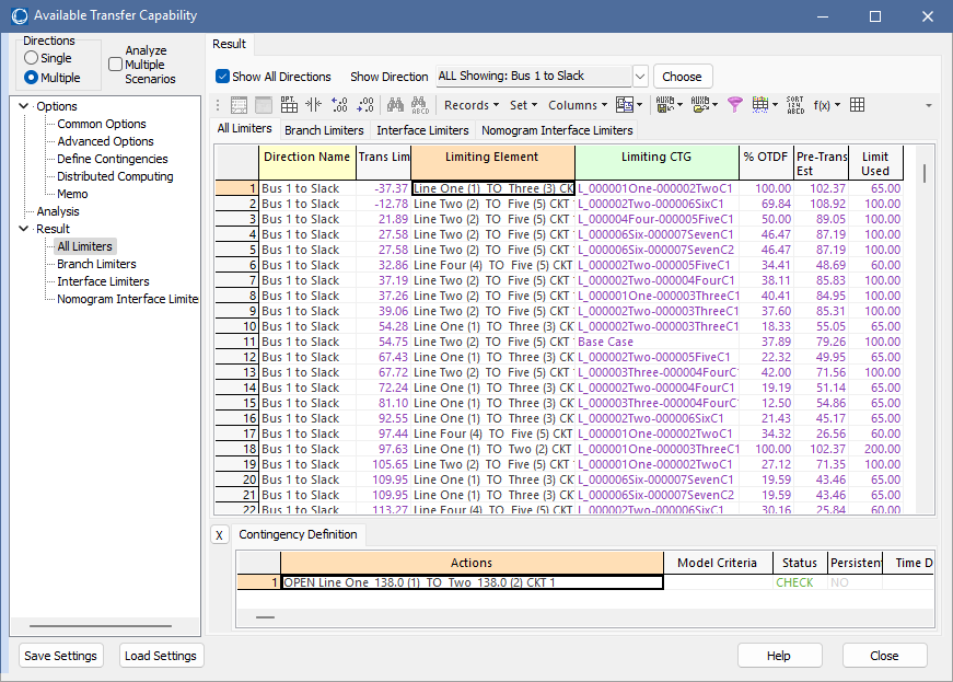 The Multiple Directions Available Transfer Capability Result page is found on the Available Transfer Capability dialog. This page is visible when performing ATC analysis when the Directions option is set to Multiple and using a single system state, i.e., not analyzing Multiple Scenarios. The Result page consists of two sections: a Transfer Limiters Display and a Contingency Definition Display.