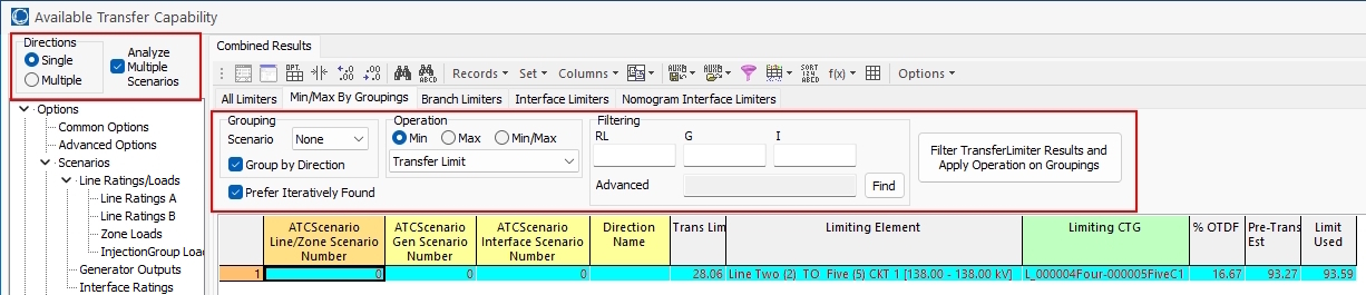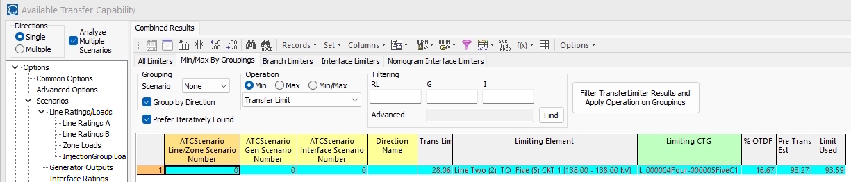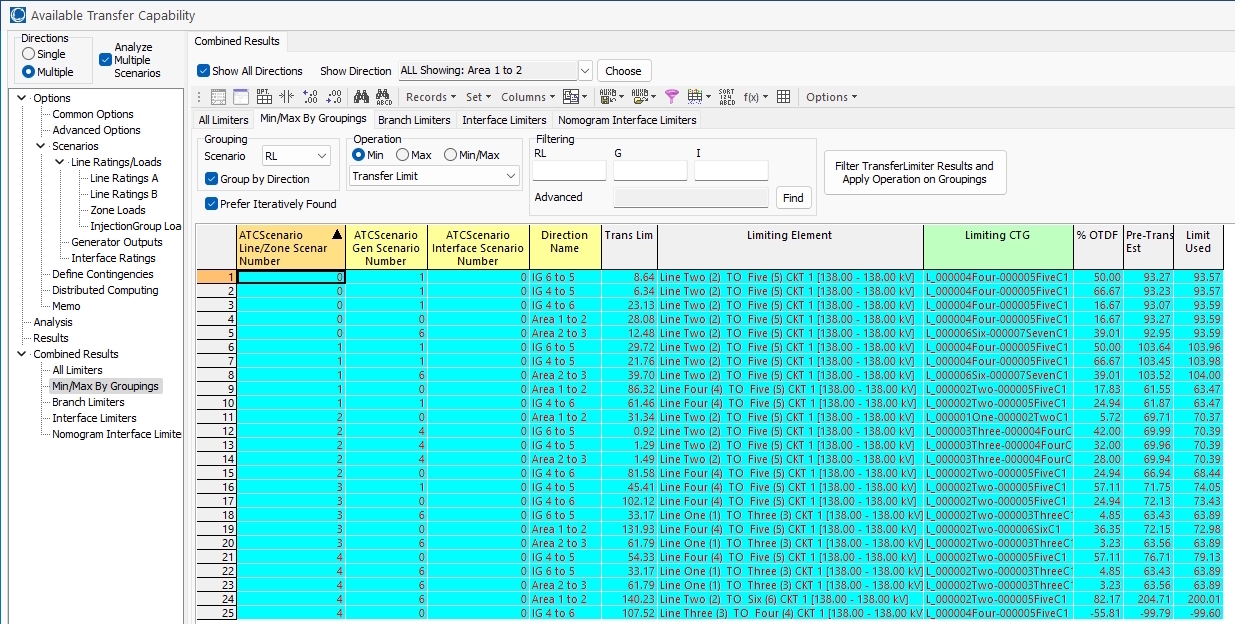 The Min/Max By Groupings page is available on the Combined Results page of Multiple Scenario ATC Analysis on the Available Transfer Capability dialog when selecting the option to Analyze Multiple Scenarios at the top of the Available Transfer Capability dialog. Through the options on this page the reporting of minimum or maximum limiters can be done over a selection of ATC scenarios and groupings. The results that are reported are the limiters that meet the chosen operation for the selected groupings. Multiple scenario ATC results must be calculated before using the options on this page. This page only affects the reporting of results and does no new TransferLimiter calculations.
