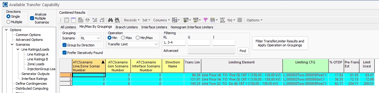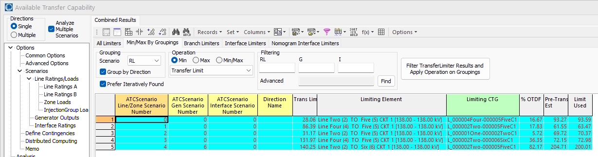 With the following options there is a result for each RL scenario under each direction (5 RL scenarios under 5 directions = 25 results). The minimum Transfer Limiter for each grouping is found considering the limiters that have been iteratively found.