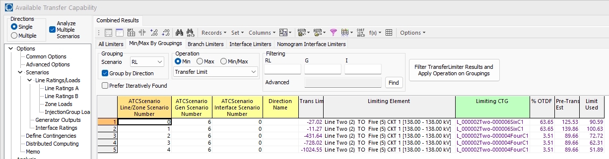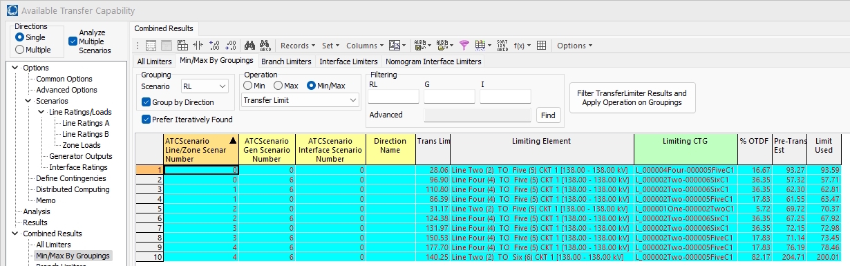 With the following options there is only a single result. There is only one direction that is being run for 35 (5 RL scenarios and 7 G scenarios = 35 total) scenario results. The minimum Transfer Limiter for all scenarios is determined based on the limiters that have been iteratively found.