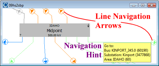For transmission lines whose end-points are not visible at the present pan/zoom level, small Line Navigation Arrows will appear where the line exits the present window. If you click on these arrows, the oneline will automatically pan over to the other end of the transmission line. The oneline will zoom out as it moves away from the present position and zoom back in until it finishes at the same zoom level with the endpoint in the middle of the oneline. On the Oneline Tab of the Simulator Options dialog you can control three attributes for these arrows