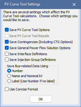 The PV Curve Tool Settings dialog shown below will be displayed with options for specific data to include in the auxiliary file. Check the box next to a particular data set to save this data in the auxiliary file. Which key field to use when identifying objects in the file can also be specified on this dialog. Click OK on this dialog to finalize saving the file or close the dialog to abandon the file save.