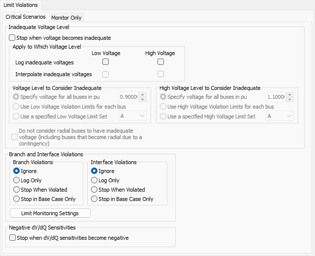 Branch and interface violations can be monitored or treated as critical scenarios. Limit Monitoring Settings determine which branches and interfaces are monitored and the limits that should be used for determining violations. For each type of element the following options are available: