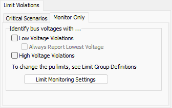 These options will store monitored bus voltages that violate either their high or low voltage limit as of the last successful solution for each scenario. Only those buses that are set to be monitored based on the Limit Monitoring Settings will be monitored, and the low and high voltage limits for each bus are also determined by the limit monitoring settings.