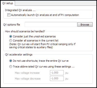 Each QV curve will be computed over the voltage range specified for the bus in the QV options file. This voltage range may be specific to that bus or may be a window what has been defined for the entire run.