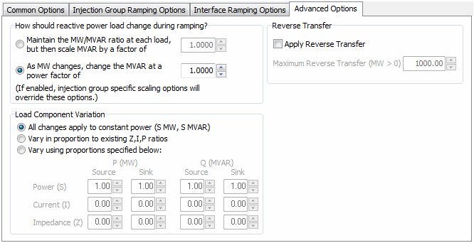 The power transfer that occurs during the PV analysis is a real power (MW) transfer. Loads can be specified as part of either the source or sink injection group that define the transfer. When loads are included in the transfer, the default is to only adjust the real power (MW) component of the load and leave the reactive power (Mvar) component constant. If any change is made to the reactive power load (Mvar) during the transfer, the default is to have all changes be made to the constant power component of the load. The Advanced Options tab allows specification of load variation for both real and reactive load to be something other than the defaults during the transfer.