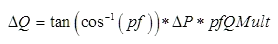 An additional multiplier, pfQMult, can be specified in order to modify the total reactive power load change to allow adjustment away from the present power factor. This multiplier is 1.0 by default. The change in reactive power load is then: