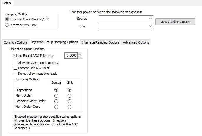 Use this drop-down box to identify the source injection group. To model an increase in transfer, generator points in the source injection group will increase their output, and load points will decrease their magnitude in amounts proportional to their participation factors.