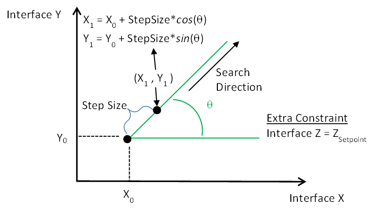 If both Interface X and Y are defined, an Angle must also be defined. This specifies the Search Direction. The process starts at X0, Y0, which is the base case flow for both Interface X and Interface Y, and increase the Step Size along the Search Direction until a critical point is found. At each step, the new values for the limits of Interface X and Interface Y are determined base on the distance along the Search Direction and the Angle. The OPF tires to enforce the flows on both interfaces to these new limits.