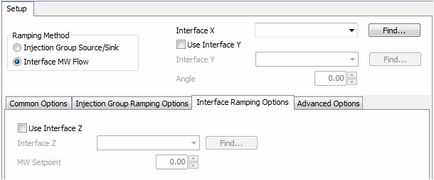 An optional third Interface Z can be defined. If this is defined, a single MW Setpoint for the flow on this interface must be specified. The ramping process is the same as described above ramping for either Interface X or Interface X and Interface Y, except now the OPF tries to enforce the flow on Interface Z to the same setpoint at each step.
